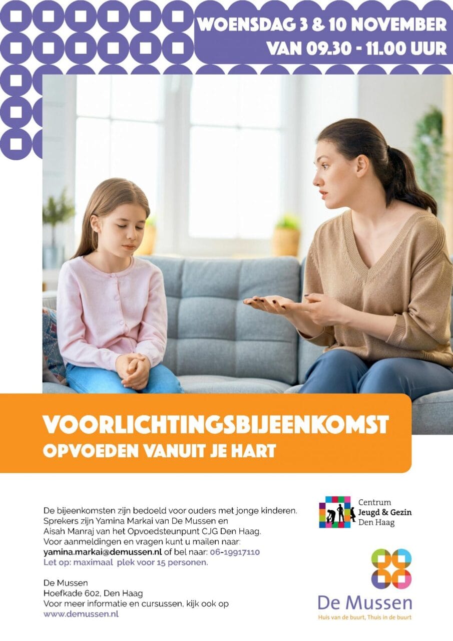 Yamina Markai van De Mussen en Aisah Manraj van het Opvoedsteunpunt CJG Den Haag verzorgen op 3 en 10 november bijeenkomsten over opvoeden vanuit je hart. Per bijeenkomst kunnen 15 mensen deelnemen.